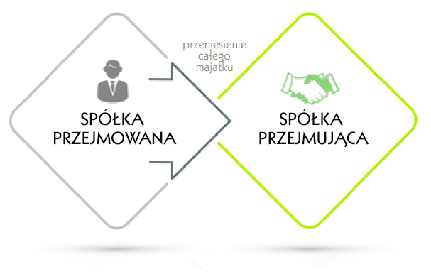 - przeniesienia całego majątku spółki (połączenie przez przejęcie) na inną spółkę (przejmującą) w zamian za udziały lub akcje, które spółka przejmująca wydaje wspólnikom spółki przejmowanej.